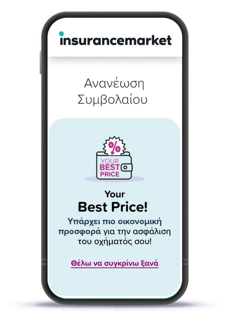 Με την δωρεάν υπηρεσία μας Your Best Price, ψάχνουμε εμείς την αγορά για εσένα και αν βρούμε χαμηλότερο ασφάλιστρο για την ασφάλιση του οχήματός σου από αυτό της ανανέωσής σου, σε ενημερώνουμε ηλεκτρονικά!